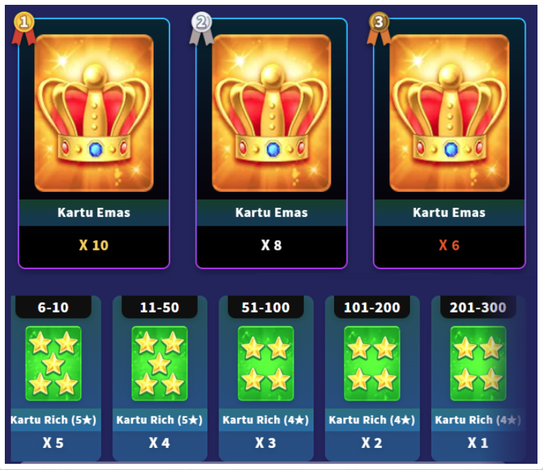 2. Jika Pemain berada di peringkat 1–300 pada waktu penutupan, Pemain akan menerima hadiah sesuai peringkat.